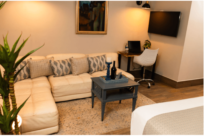 Our most complete room — a spacious suite with a king bed, a dedicated rest area, and a partial kitchen. Perfect for longer stays or guests who want extra room to relax and work comfortably.